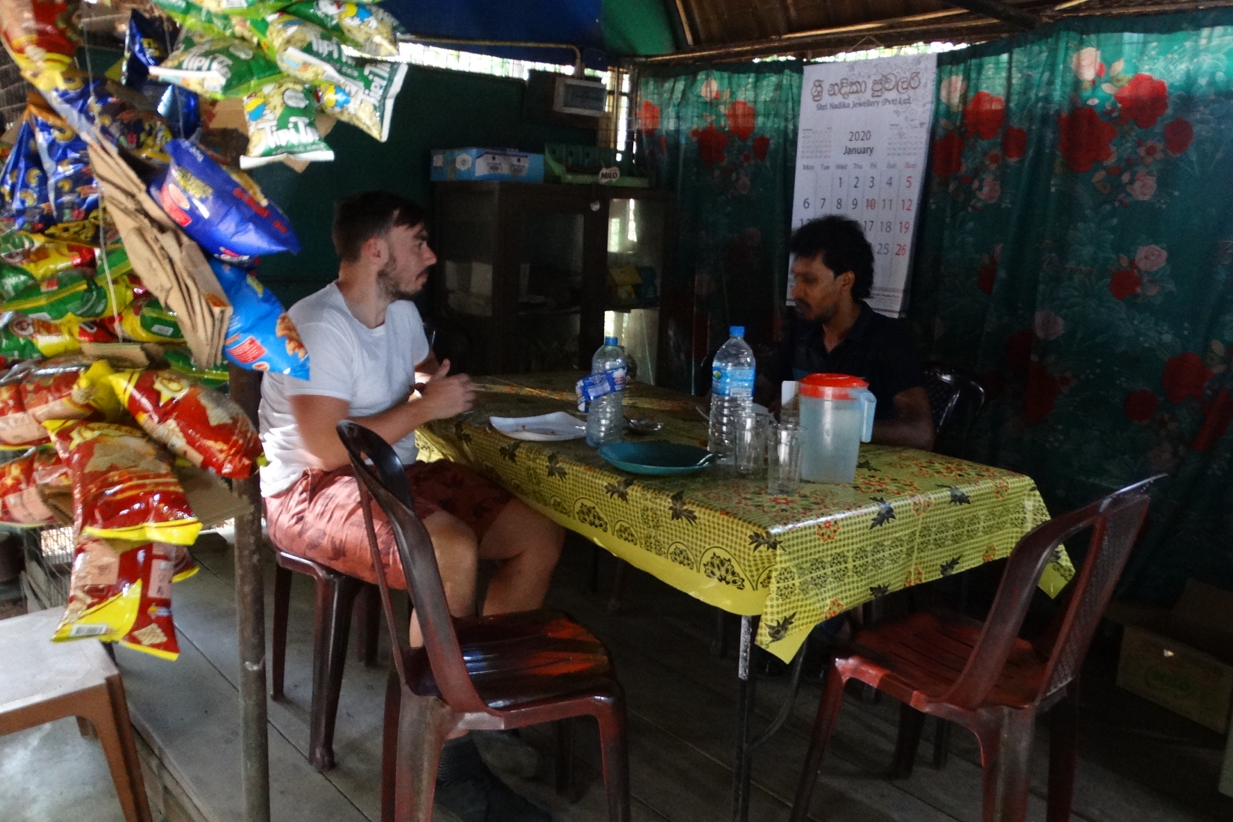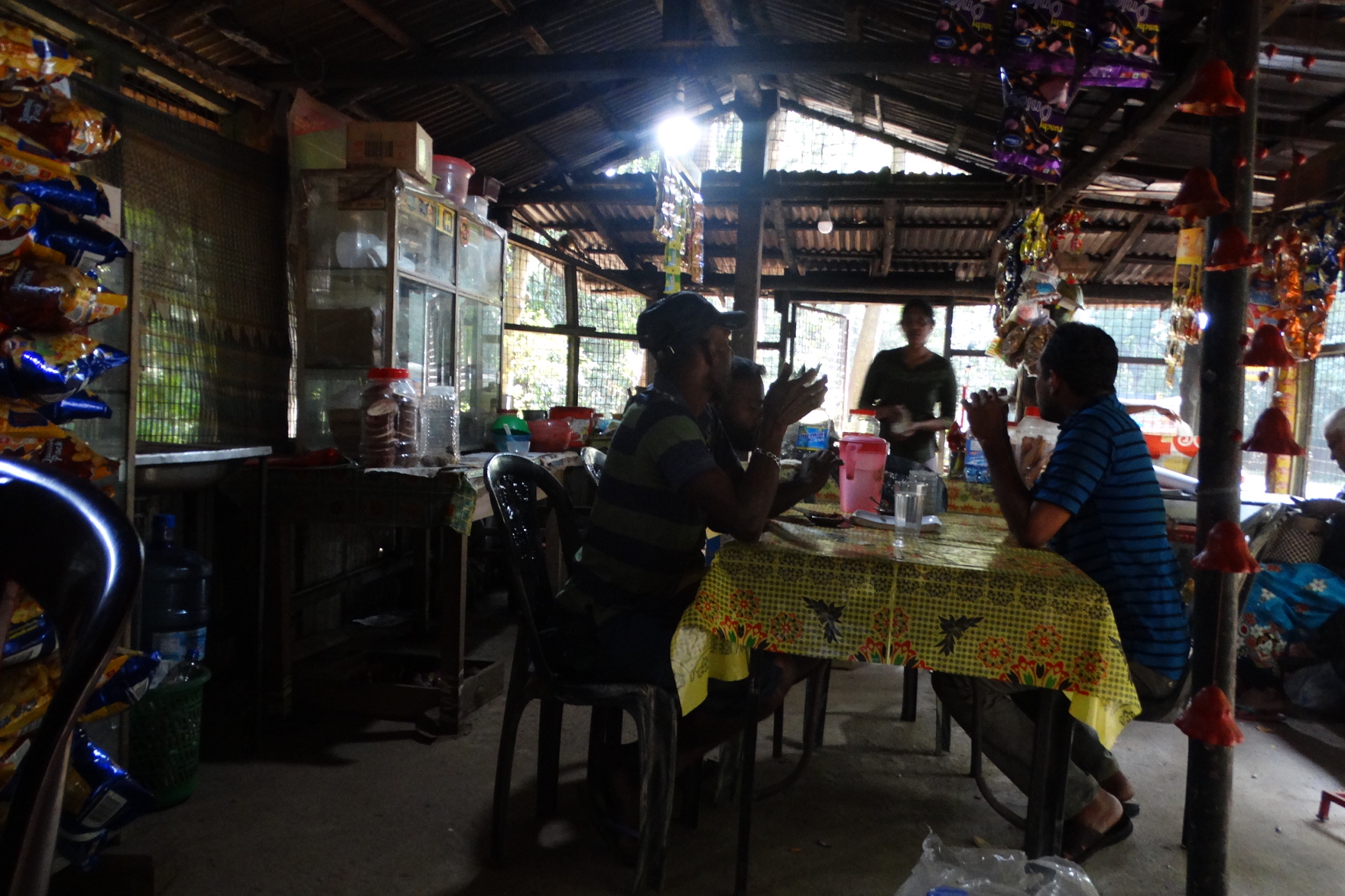 Περνάμε το βράδυ σε ενα ecolodge και για το δείπνο μας ψάχνουμε σαν τους τυπικούς τουρίστες στο tripadvisor για κάποιο δημοφιλές εστιατόριο. Διαλέγουμε το Gamagedara αλλά όταν φτάνουμε το βρίσκουμε …άδειο με μόνο την ιδιοκτήτρια/μαγείρισσα και τους δύο βαριεστημένους έφηβους γιους της. Ρωτάμε αν είναι ανοιχτά και αν θα μπορούσανε να μας ετοιμάσουνε κάτι, μας απαντάνε ναι, φυσικά σε όλα και κάποια ώρα μετά απολαύσαμε νοστιμότατο ψάρι με κάρυ και ρύζι. Γενικά όπου και να φάγαμε στη Σρι Λάνκα, μείναμε αρκετά ικανοποιημένοι απο την γεύση, την καθαριότητα και τις τιμές.