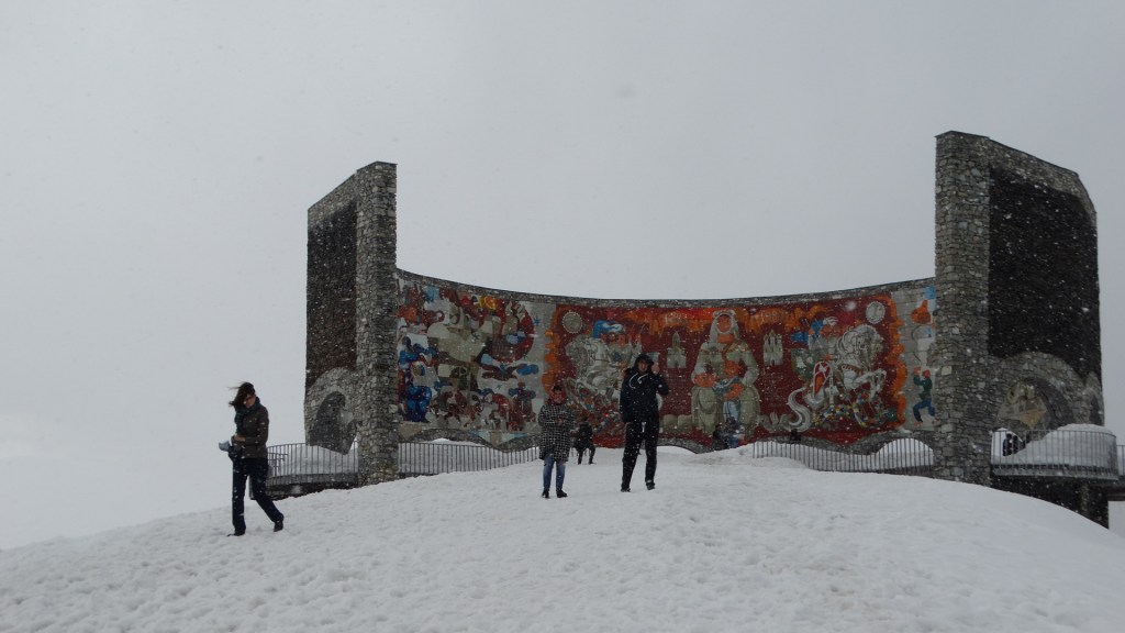 Λίγα χιλιόμετρα πιο μακριά βρίσκουμε το μνημείο της Ρωσσο-γεωργιανής φιλίας,το οποίο χτίστηκε το 1983 και σήμερα πλέον αποτελεί απόδειξη του παράδοξου ρευστότητας των γεωπολιτικών συσχετισμών και μεγαλείο ειρωνείας παρά αρχιτεκτονικής. Πρόκειτα για ένα ημικυλινδρικό κτίσμα στην εσωτερική πλευρά του οποίου υπάρχουν διάφορα μωσαϊκά με θέμα τις σχέσεις των δύο λαών. Παρκάρουμε και αρχίζουμε να περπατάμε προς τα εκεί μα πριν καν προλάβουμε να διανύσουμε τα 300-400 μέτρα που μας απομένουν, ξεσπά σφοδρή χιονόπτωση και οι διάφοροι γεωργιανοί μικροπωλητές που βρίσκονται παρεταγμένοι τριγύρω αρχίζουν να φωνάζουν και να κάνουν νοήματα στους τουρίστες να απομακρυνθούν.