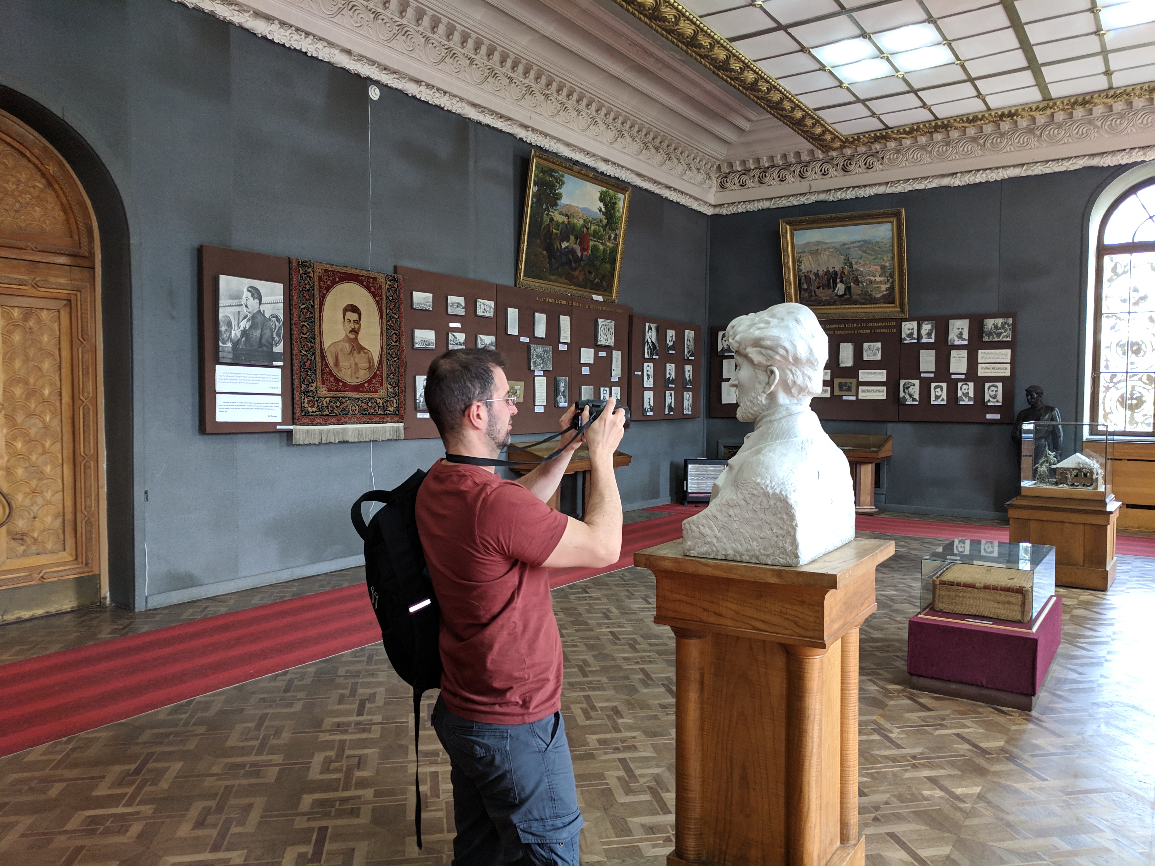 Ιδιαίτερα απαιτητική και δύσκολη θεωρώ ότι πρέπει να ήταν η ισορροπία που έπρεπε να κρατήσει η ξεναγός μας, η οποία μας εξήγησε τι υπάρχει σε κάθε αίθουσα δίχως στιγμή να προχωρήσει σε εκφορά ιστορικής γνώμης. Στο τέλος της ξενάγησης, μόλις έχει τελειώσει την παρουσίαση των χώρων του προσωπικού βαγονιού του Στάλιν για τις μετακινήσεις του, την ρωτάμε πως νιώθουν οι ντόπιοι για τον βίο και την πολιτεία μιας αδιαμφησβήτητα σημαντικής ιστορικής φιγουρας αλλά ταυτόχρονα και τόσο διάσημης για την αδίστακτη σκληρότητα που επέδειξε στα χρόνια ηγεμονίας του. Η κοπέλα μας απαντάει γρήγορα και κοφτά ότι «τον λατρεύουμε και τον ευγνωμονούμε για όσα πρόσφερε στην Ρωσσία και την Γεωργία». Είναι δύσκολο να σταθεί κανείς κριτικά στους δικούς του ηγέτες/ήρωες/σφαγείς. Δεν το έχω δεί να γίνεται σχεδών πουθενά. Ούτε σε μουσεία ιστορίας στις ΗΠΑ, ούτε στη Γαλλία, ούτε και στην Ελλάδα εδώ που τα λέμε. Μόνη εξαίρεση ίσως η Γερμανία και η ομόφωνη καταδίκη του ναζιστικού παρελθόντος της. Όποτε ίσως είναι άδικο να περιμένω από αυτή τη γυναίκα να κάνει κάτι αντίστοιχο, ειδικά την στιγμή που η ίδια εργάζεται για έναν πολιτιστικό φορέα αφιερωμένο στο πιθανό αντικείμενο κριτικής.