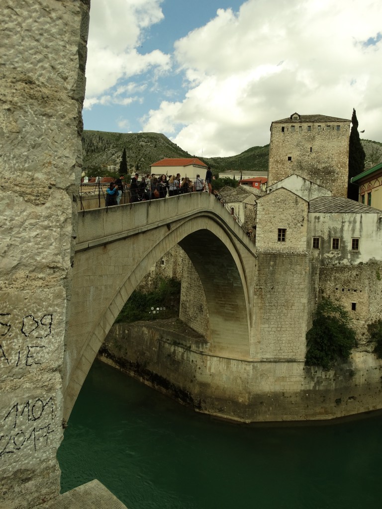 Η εικόνα που μου ήρθε στο νου καθώς αντικρύζω το μνημείο είναι αυτή του βομβαρδισμού και καταστροφή της κατά τη διάρκεια του πολέμου, σε αυτή την περίπτωση από κροατικές δυνάμεις. Η άψογη επανακατασκευή της με κάνει να νιώθω ασιοδοξία για το μέλλον. Λίγη περισσότερη έρευνα στην γκετοποιημένη πραγματικότητα της πόλης όμως με ξαναρίχνει στη μελαγχολία. Το Μόσταρ έχει δύο κύριες πληθυσμιακές ομάδες, Κροάτες και Βόσνιους-Μουσουλμάνους που λίγα πάρε δώσε έχουν πλέον μεταξύ τους. Η πόλη έχει δυο διαφορετικα πυροσβετικά σώματα, δύο διαφορετικές υπηρεσίες αποκομιδής σκουπιδιών…μέχρι και δύο διαφορετικά club στα οποία συχνάζουν οι νεολαίες των δύο αυτών κοινοτήτων. Υπάρχουν ουσιαστικά αόρατα θλιβερά σύνορα και όλοι μοιάζουν να γνωρίζουν ποια είναι αυτα.