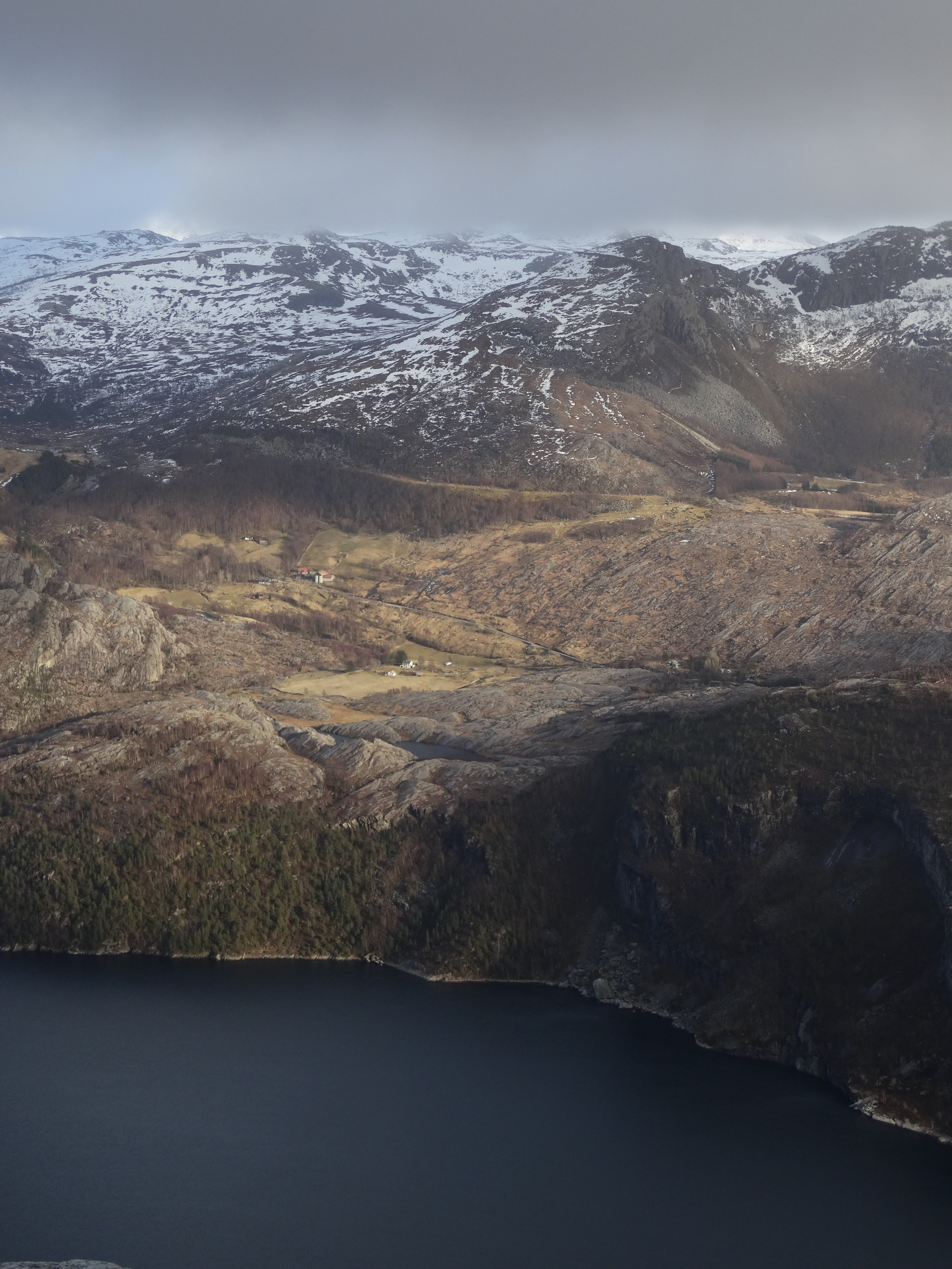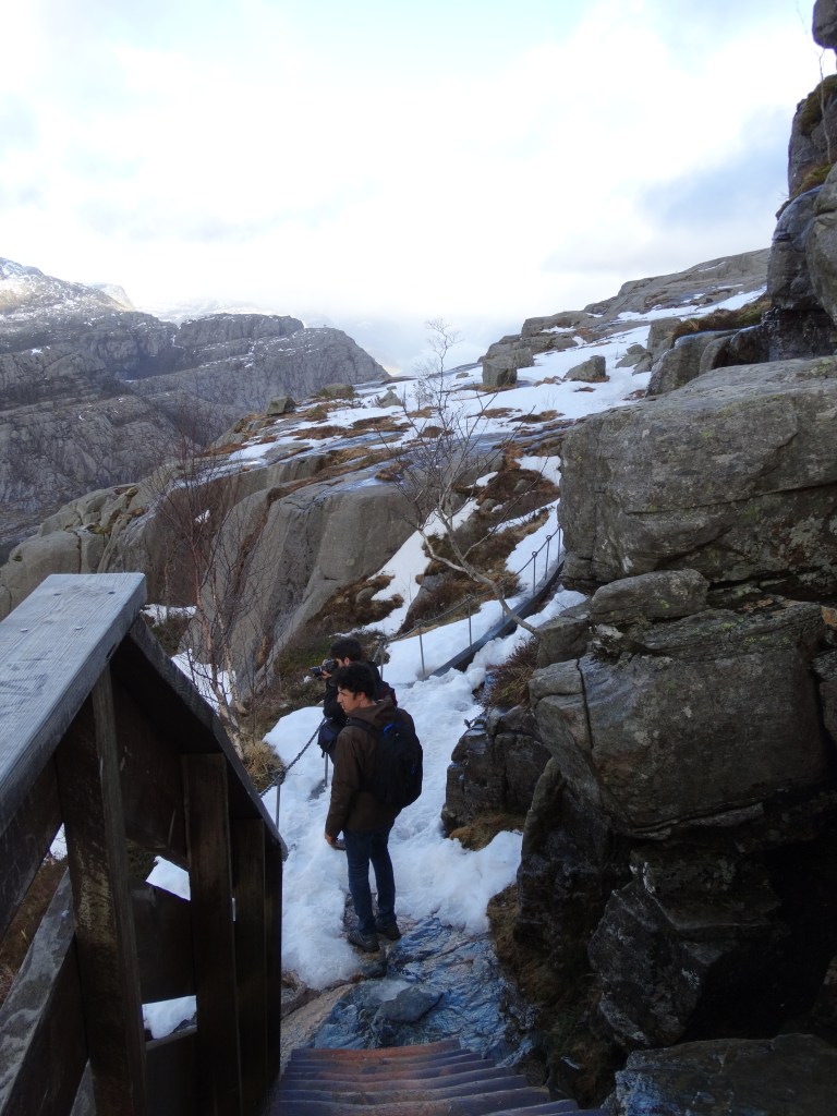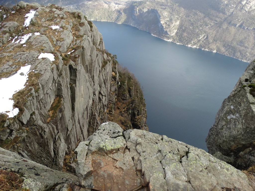 Όταν τελικά φτάσαμε στο Preisteklen μένω άναυδος με την απόκοσμης ομορφιάς θέα αλλά και με την επικινδυνότητα του συγκεκριμένου αξιοθέατου. Παρότι ένας ισπανός τουρίστας έχασε τη ζωή του εδώ το 2013, οι νορβηγικές αρχές ίσως και σωστά να σκέφτηκαν ότι προστατευτικά κάγκελα ή σχοινιά θα παρεμβαίνανε στην κοφτερή τελειότητα της φύση. Η ευθύνη της σωματικής σου ακεραιότητας είναι αποκλειστικά δική σου, μοιάζει να σου λένε. Τουρίστα, είσαι ενήλικας πια! Με ξαφνιάζει η αφοβία και άγνοια κίνδυνου πιτσιρικάδων τουριστών που πηγαίνουν στην άκρη άκρη και βγάζουν selfies με σατηρικές πόζες αλα στάση του λοτού.