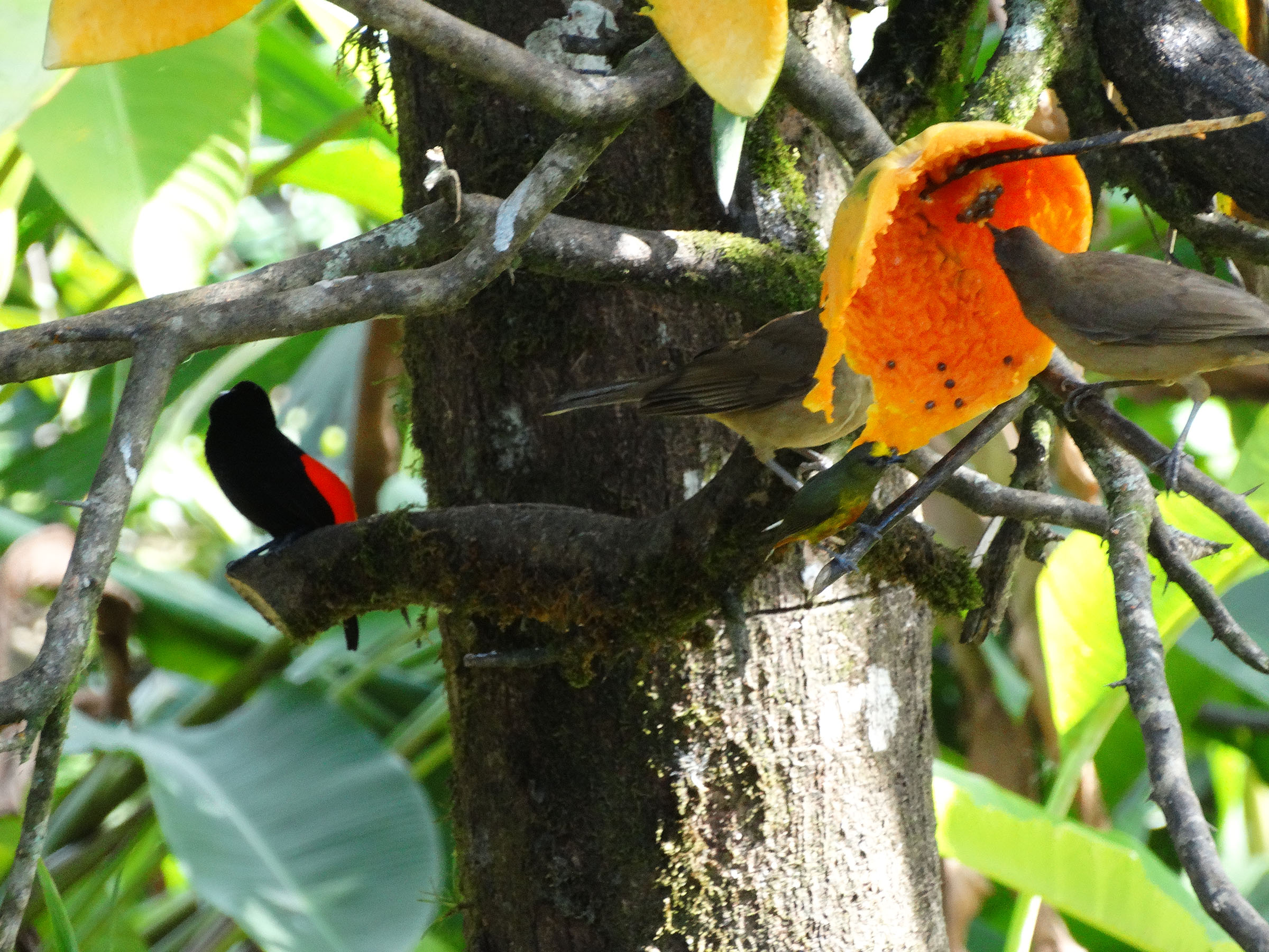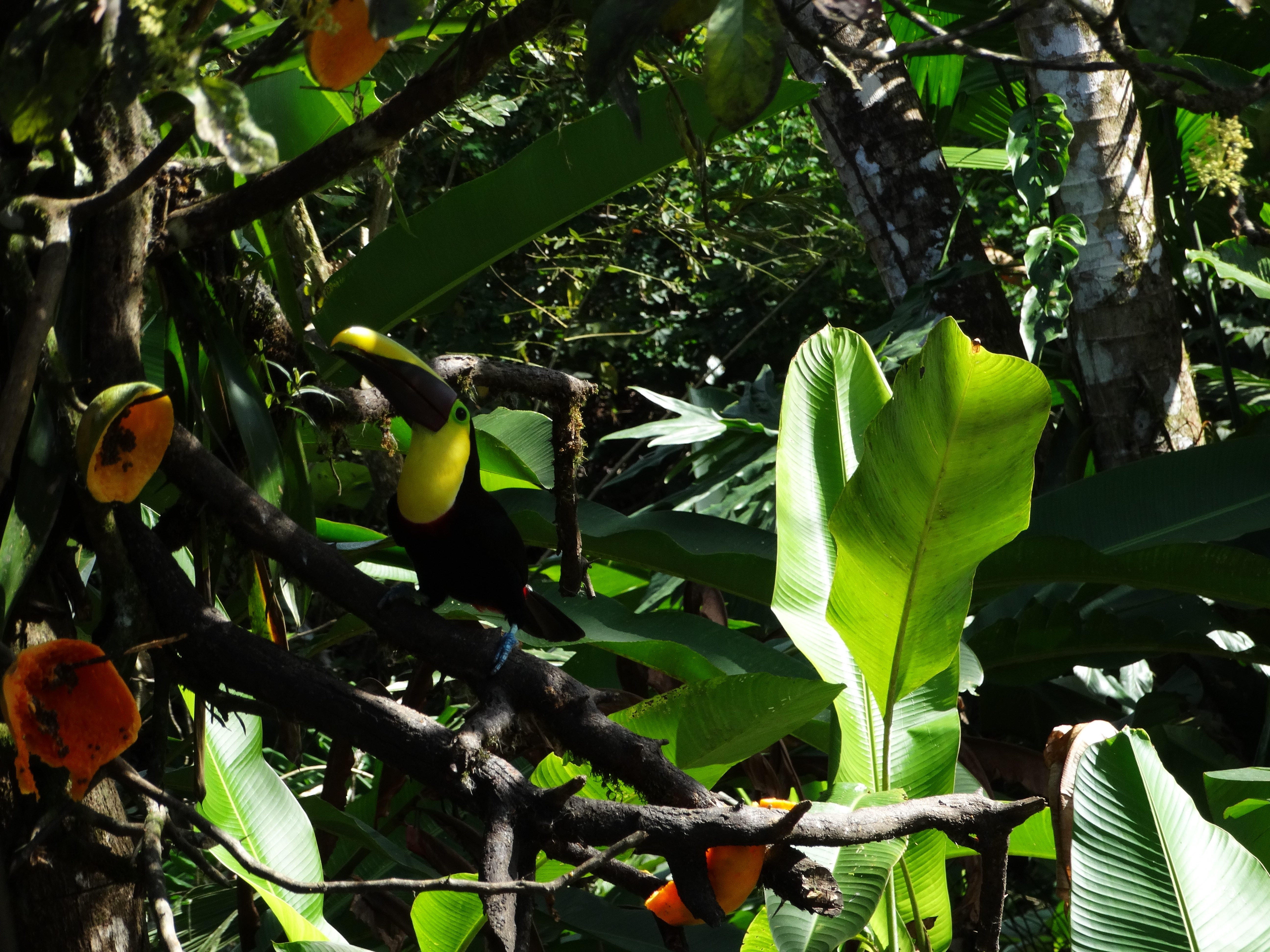 Θυμάμαι ότι μετά την μονοήμερη ξενάγηση πήγαμε να κολατσίσουμε σε ένα τυχαίο εστιατόριο ( συμπεριλαμβανόταν ημιδιατροφή στο tour ) λίγο έξω από το χωριό. Καθώς αναμέναμε το φαγητό μας και συζητούσα με μία οικογένεια Καναδών που συμμετείχανε στο ίδιο γκρουπ, προσγειώνεται σε ένα κλαδί ακριβώς δίπλα μου ένα Τουκάν(!), ένα πανέμορφο πτηνό με εντυπωσιακά φτερά (τελευταία φώτο στο τέλος του κειμένου) και τεράστιο κίτρινο ράμφος.Οι αναλογίες και οι χρωματισμοί είναι όλα τόσο έντονα που σχεδών νομίζεις ότι πρόκειται για καρτούν. Ήταν όντως τόσο αναπάντεχο ένα πλάσμα τόσο παραδείσιο να τσιμπολογάει καρπούς τόσο κοντά σου που σχεδών το άγγιζες.