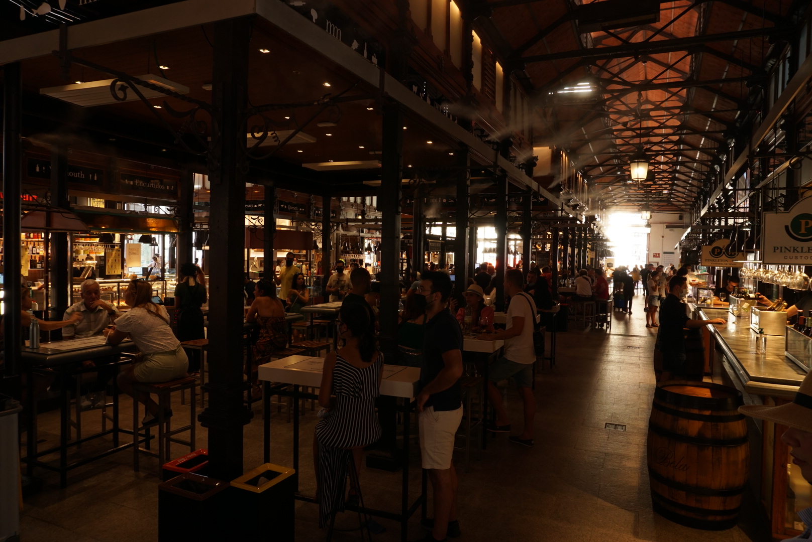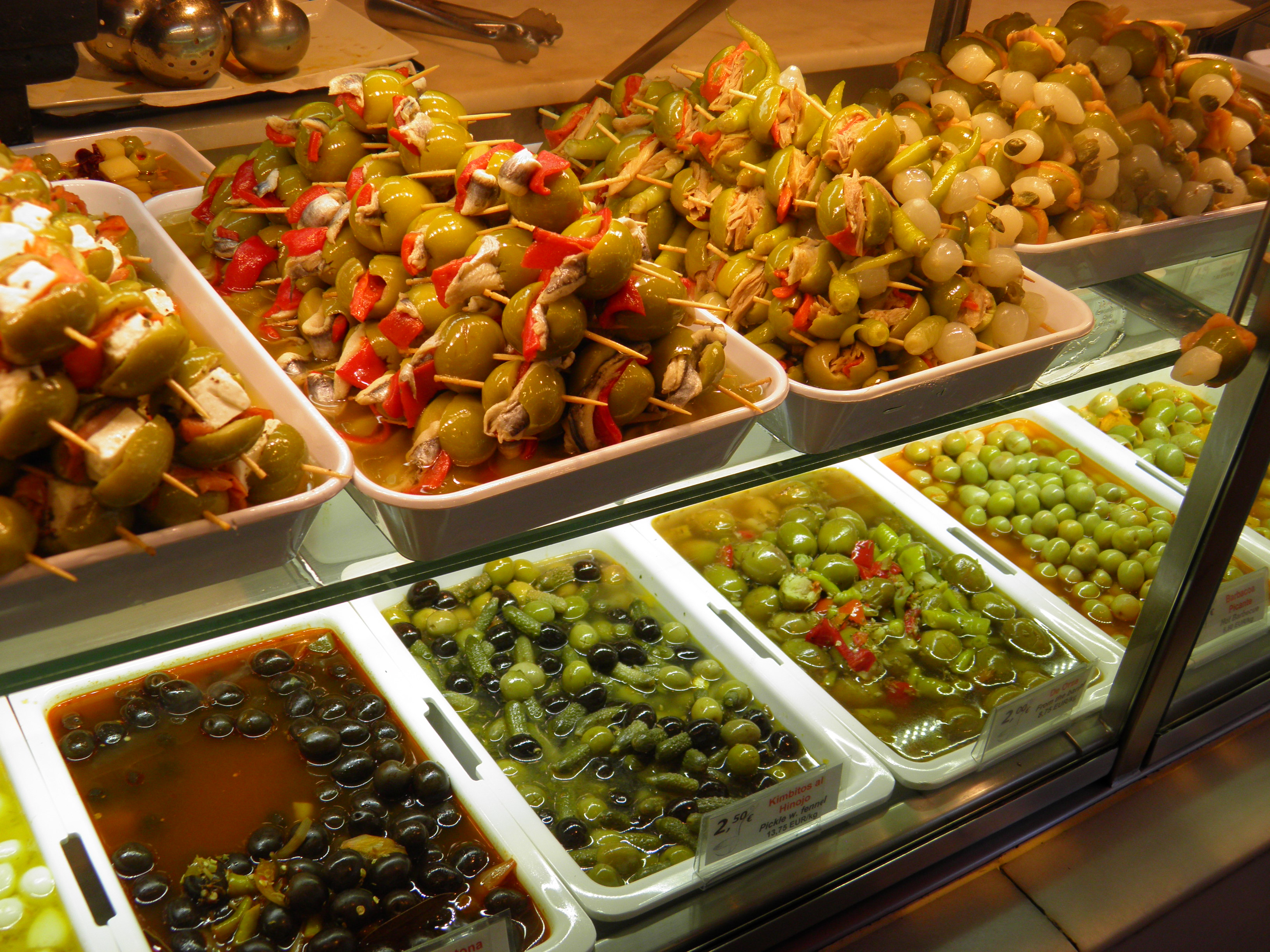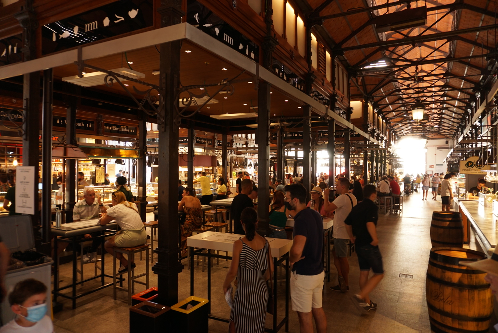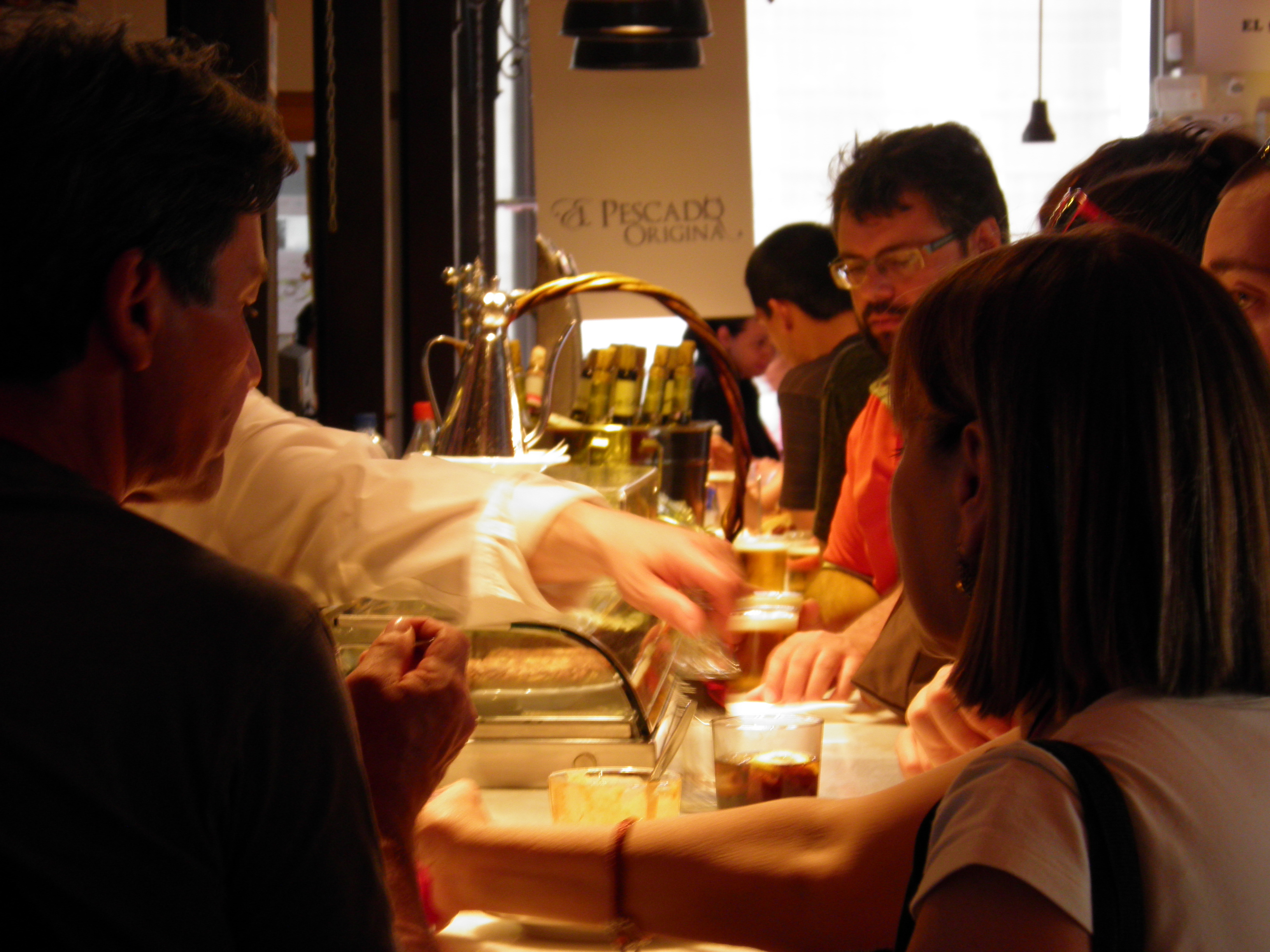 Σε απόσταση αναπνοής το mercado του San miguel. Σε όλη την Ισπανία αντι των λαϊκών που συναντούμε στην πατρίδα, υπάρχουν τσιμεντένιες δομές συνήθως ημϊυπόγειες όπου μόνιμες επιχειρήσεις είναι συγκεντρωμένες και λειτουργούν εκεί ( μανάβικα, χασάπικα, τυροπωλεία, ψαροπωλεία). Μεταξύ αυτών συναντά κανείς και πολλά μικρά εστιατόρια και bar. Στα μητροπολιτικά κέντρα πολλές από αυτές τις αγορές έχουν ανακαινιστεί και έχουν εστιάσει περισσότερο στο ποτό και το φαγητό για τους τουρίστες παρά στα ψώνια για το σπίτι. Εξέχων παράδειγμα και η συγκεκριμένη στην οποία προσφέρονται tapas και ποτό και που παρά την κεντρική της θέση και την τουριστική της επιτυχία ( δέκα εκατομμύρια επισκέπτες το χρόνο δηλώνει όλο περηφάνεια το site του δήμου της Μαδρίτης), η ποιότητα των διαθέσιμων εδεσμάτων έιναι αρκετά υψηλή. Αντίστοιχες προσδοκίες υπάρχουν για την παρεμφερή σε λογική αγορά του Μοδιάνο που θα ανοίξει ( άνοιξε; ) στην Θεσσαλονίκη.