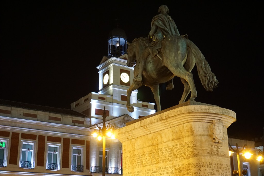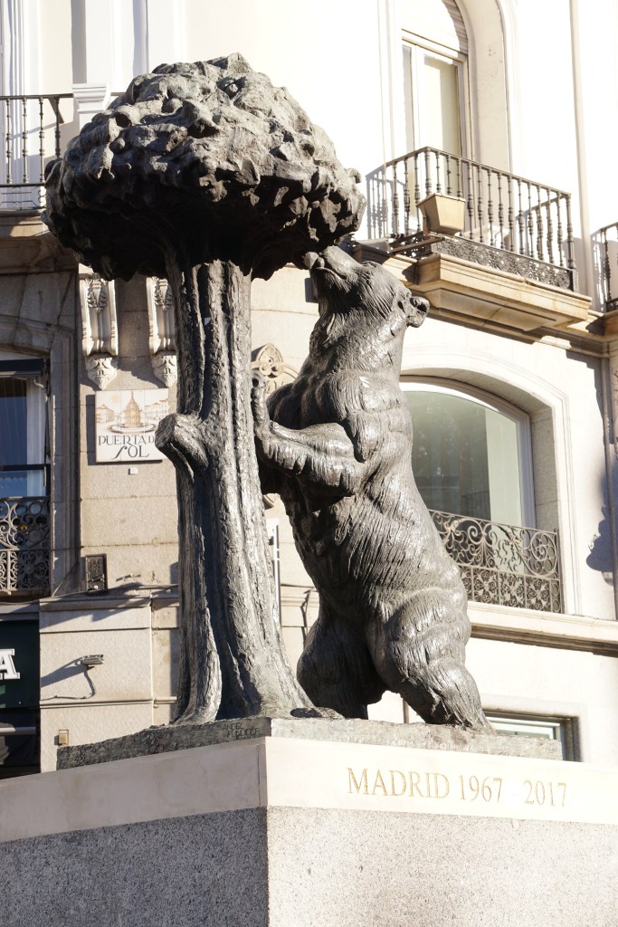 Μερικές εκατοντάδες μέτρα μακριά βρίσκεται η πλατεία Puerta del Sol– εκεί συντάει κανείς και το σήμα κατατεθέν της πόλης, το άγαλμα της Αρκούδας και της Φραουλιάς σμιλεμένο σε πέτρα και γρανίτη. Πρόκειται για ένα μέρος που λειτουργεί κυρίως ως σημείο συνάντησης για τους κατοίκους της ( κάπως σαν την Καμάρα στη Θεσσαλονίκη) όπως επίσης και συγκέντρωσης κόσμου για ποικίλους λόγους, από διαμαρτυριες μέχρι εορτασμούς όταν πχ κάποια ισπανική ποδοσφαιρική ομάδα τα πάει καλά σε διεθνή τουρνουά. Επίσης κάθε Δεκέμβρη την παραμονή της πρωτοχρονιάς εδώ είναι που μαζεύονται τα πλήθη για να υποδεχθούν το πέρασμα του χρόνου με όση βεβιασμένη αισιοδοξία μπορεί ο καθένας να αντλήσει. Πάμπολοι οι πεζοδρομημένοι δίαυλοι που ξεκινούν από εδώ και οδηγούν σε άλλα σημεία ενδιαφέροντος της ισπανικής πρωτεύουσας. Υπάρχει μάλιστα μία συνεχόμενη προσπάθεια να δοθεί ακόμα μεγαλύτερο τμήμα του κέντρου σε αποκλειστική χρήση των πεζών, εγχείρημα παραδόξως αρκετά αμφιλεγόμενο στις εκάστοτε δημοτικές εκλογές.