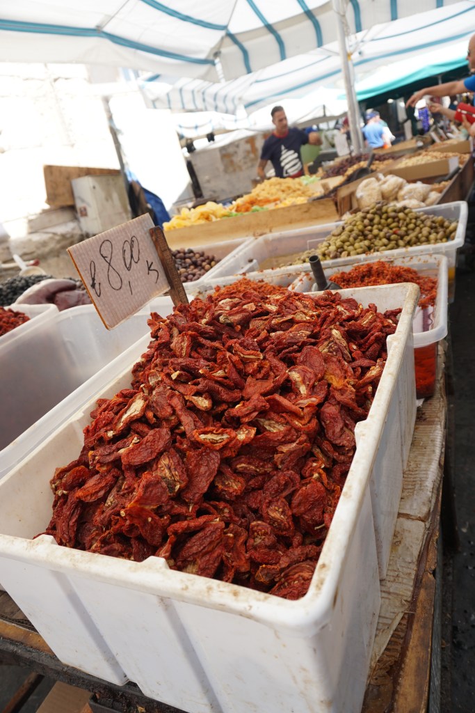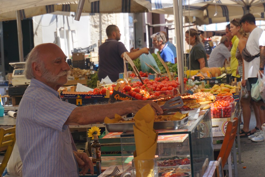 Ίσως το πιο ενδιαφέρον σημείο της να είναι η λαϊκη της αγορά της όπου βλέπει κανείς τους ηλικιωμένους πωλιτές να εμπορεύονται φρούτα, οπωροκηπευτικά, ψάρια, κρέας και κάθε είδους τυριά και αλλαντικά όχι πια μόνο σε συντοπίτες τους που ψωνίζουν για το μεσημεριανό τραπέζι αλλά κυρίως σε θαμπωμένους τουρίστες που φωτογραφίζουν το κάθε τι πριν το αγοράσουν και καταναλώσουν. Ζώντας στην Αγγλία εδώ και οκτώ χρόνια, ένιωσα ιδιαίτερα αδικημένος που η πρόσβαση μου εκεί σε οτιδήποτε φρέσκο είναι τόσο περιορισμένη και υπερκοστολογημένη.