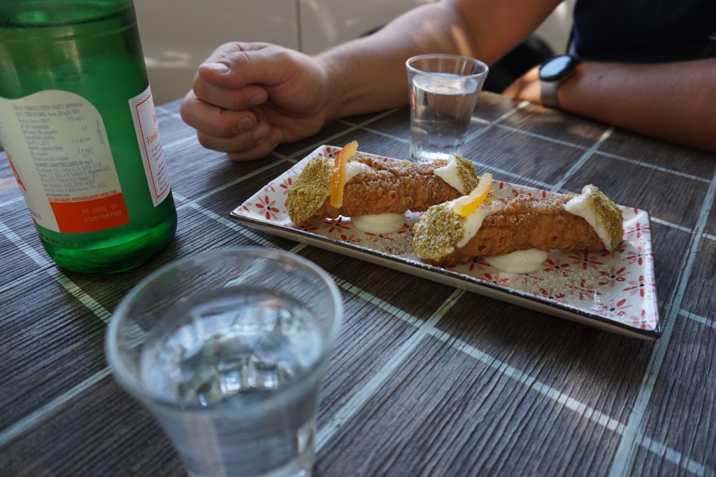 Παρόμοιας καλαισθησίας η βόλτα μας και στη Modica, έναν τόπο ιδιαίτερα φημισμένο για την σοκολάτα του αλλά εμείς εδώ πρωτοδοκιμάσαμε μία άλλη ιταλική σπεσιαλιτέ, το περίφημο canoli. Πρόκειται για ιταλικό γλυκό που αποτελείται ένα περίβλημα από τηγανητή ζύμη σε σωληνοειδές σχήμα με διάφορες γεμίσεις με βάση το τυρί ρικότα. Σκουπίζω το συννεφάκι ζάχαρης από πάνω του και δοκιμάζω κάτι που έχει γεύση παραδόξως δροσερή και ελαφριά. Οι φλούδες πορτοκάλι που πρόσθεσε το συγκεκριμένο μαγαζί έδωσαν το κάτι παραπάνω σε διακριτικό γευστικό τόνο. Δεν σταθήκαμε τόσο εντυπωσιασμένοι με έναν άλλο σικελιανό μεζέ, το Arancini (τηγανητοί ριζοκεφτέδες με ποικίλη γέμιση) που είχαμε δοκιμάσει στη Συρακούσα μία μέρα πριν, για πρώτη και τελευταία φορά.