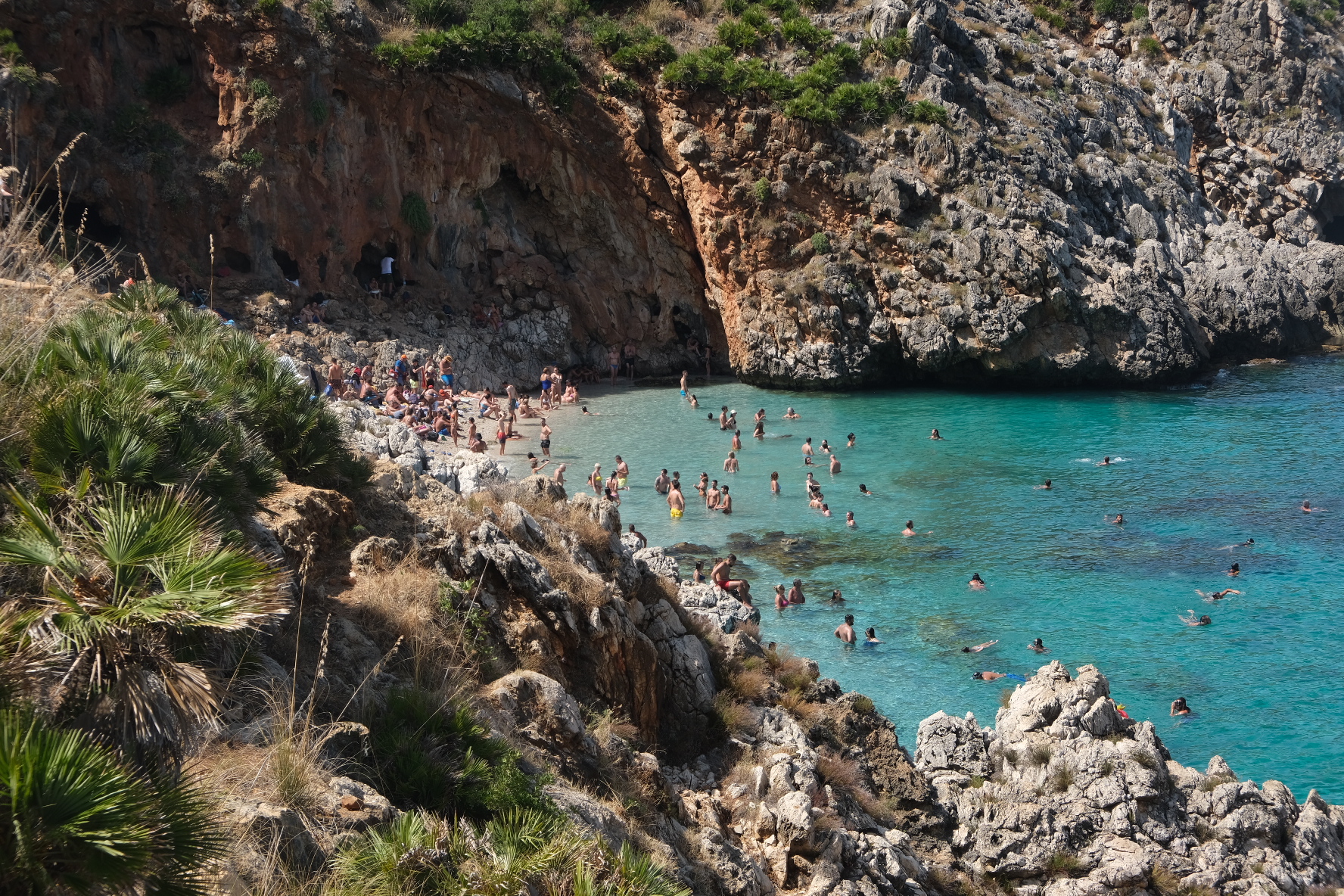 Πολύ πιο συναρπαστικό αποδείχθηκε ένα εθνικό πάρκo λίγα χιλιόμετρα μακριά (reserve naturally orientetadelo zingaro) το οποίο συγκαταλέγονταν ως κάτι το δευτερεύον στις ιστοσελίδες στο δυαδίκτιο παρότι ήταν η πραγματική ανακάλυψη στην περιοχή. Δεν ήταν τόσο για τις συμπαθητικές πεζοπορίες που προσφέρει (τις οποίες είναι δύσκολο να φέρει κάποιος εις πέρας σε συνθήκες τέτοιας ζέστης) αλλά για την παραλία του με κρυστάλλινα νερά και άπειρα ψάρια που βρίσκεται εντός του (cala capreria). Δύσκολο να πει κανείς πάντως με σιγουριά αν ο βιότοπος θα διατηρηθεί και για τις επόμενες γενιές. Άπειροι είναι οι νεαροί ιταλοί εκεί που καταναλώνουν φαγητό, ποτά και καπνίζουν και εν τέλει τη ρυπαίνουν. Χαρακτηριστική η συμπεριφορά μίας κοπέλα είχε πάρει ένα ψωμάκι ελαιόψωμο ή τυρόψωμο δεν ξέρω τι ακριβώς και το θρυμμάτισε λίγο λίγο εντός του νερού για κανένα δεκάλεπτο προκειμένου να μαζευτούν ψάρια γύρω της και να την πάρει το αγόρι της φωτογραφίες με το κινητο. Όπως και με τις χελώνες στην Κεφαλλονιά, έτσι και εδώ θεωρώ ότι η χλωρίδα μπορεί και επιβιώνει της ανθρώπινης ηλιθιότητας μόνον χάρη στο γεγονός ότι το καλοκαίρι διαρκεί μόνον τρεις με τέσσερεις μήνες και τους υπόλοιπους εννέα τα ζωντανά αφήνονται στην ησυχία τους από τους κάθε λογής ματαιόδοξους.