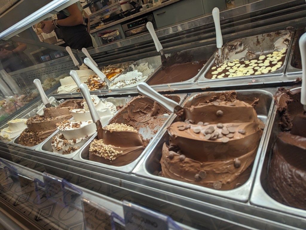 Gelato: Ποιά η διαφορά με το παγωτό; Φημισμένη ιταλική εμπειρία που έχει να κάνει με την παρασκευή αλλά και την ποικιλία γεύσεων. Πρόκειται για παγωτό που φτιάχνεται με παραδοσιακό ιταλικό τρόπο και σερβίρεται σε ψηλότερη θερμοκρασία από το συνηθισμένο, γι’ αυτό και λιώνει γρήγορα. Διαφέρει επίσης και η περιεκτικότητα του σε λιπαρά. Γεύσεις απίθανες, πολλές εμπνευσμένες από την τοπική ζαχαροπλαστική όπως πχ τιραμισού ή κέικ κασάτα ( αυτό το δεύτερο ήταν ένα ρίσκο που πήραμε μα δεν απέδωσε).