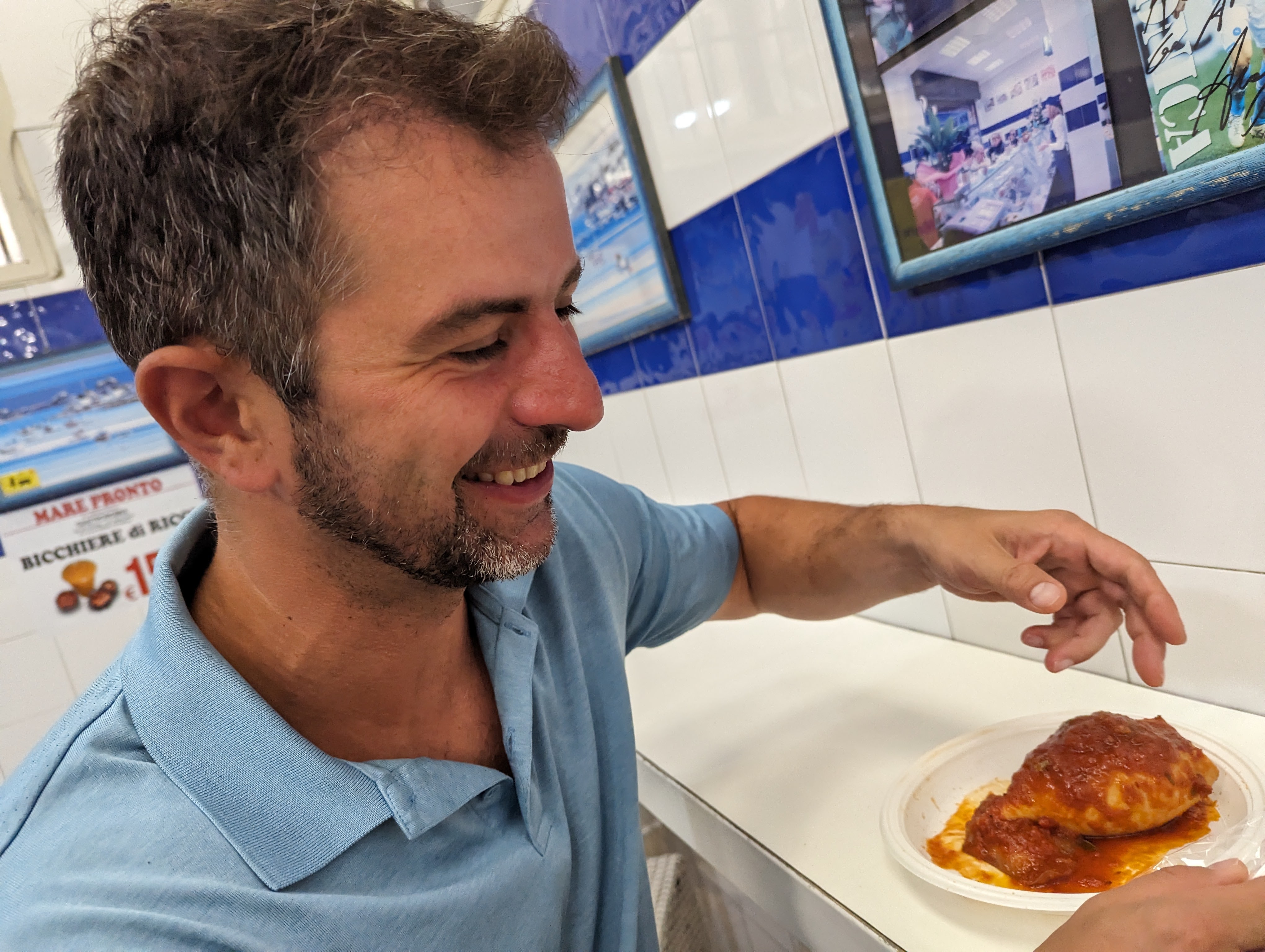 Όντας φανατικός ψαροφάγος, ήθελα να ανακαλύψω και κάποιο ιχθυοπωλείο που να πουλάει μα και να ψήνει την ψαριά του για τους θαμώνες του, όπως κάνουν και πολλά αντίστοιχα μαγαζιά στην Ελλάδα τα τελευταία χρόνια. Σε έναν πεζόδρομο δίπλα από την λαϊκή της παλιάς πόλης βρήκαμε ένα τέτοιο ψαράδικο όπου πήγαμε δύο φορές και γευματίσαμε. Πολύ καλομαγειρεμένο το φαγητό, κορυφαίες αυτές οι γεμίσεις με καβούρι και ψωμί και οι διάφορες σάλτσες ντομάτας που χρησιμοποιούσαν αν και θα ήθελα να αναφέρω ότι κανείς από τους άλλους πελάτες δεν είχε την αναμενόμενη υπομονή. Ηλικιωμένοι ιταλοί μου κάνανε νόημα να δούνε το χαρτάκι με το νούμερο της σειράς μου εξυπηρέτησης αλλά μόλις αυτή ερχόταν, αυτοί αρχίζανε να φωνάζουν στις μπερδεμένες κοπέλες που σερβίρανε τους πελάτες για να εξυπηρετηθούν οι ίδιοι πρώτοι.