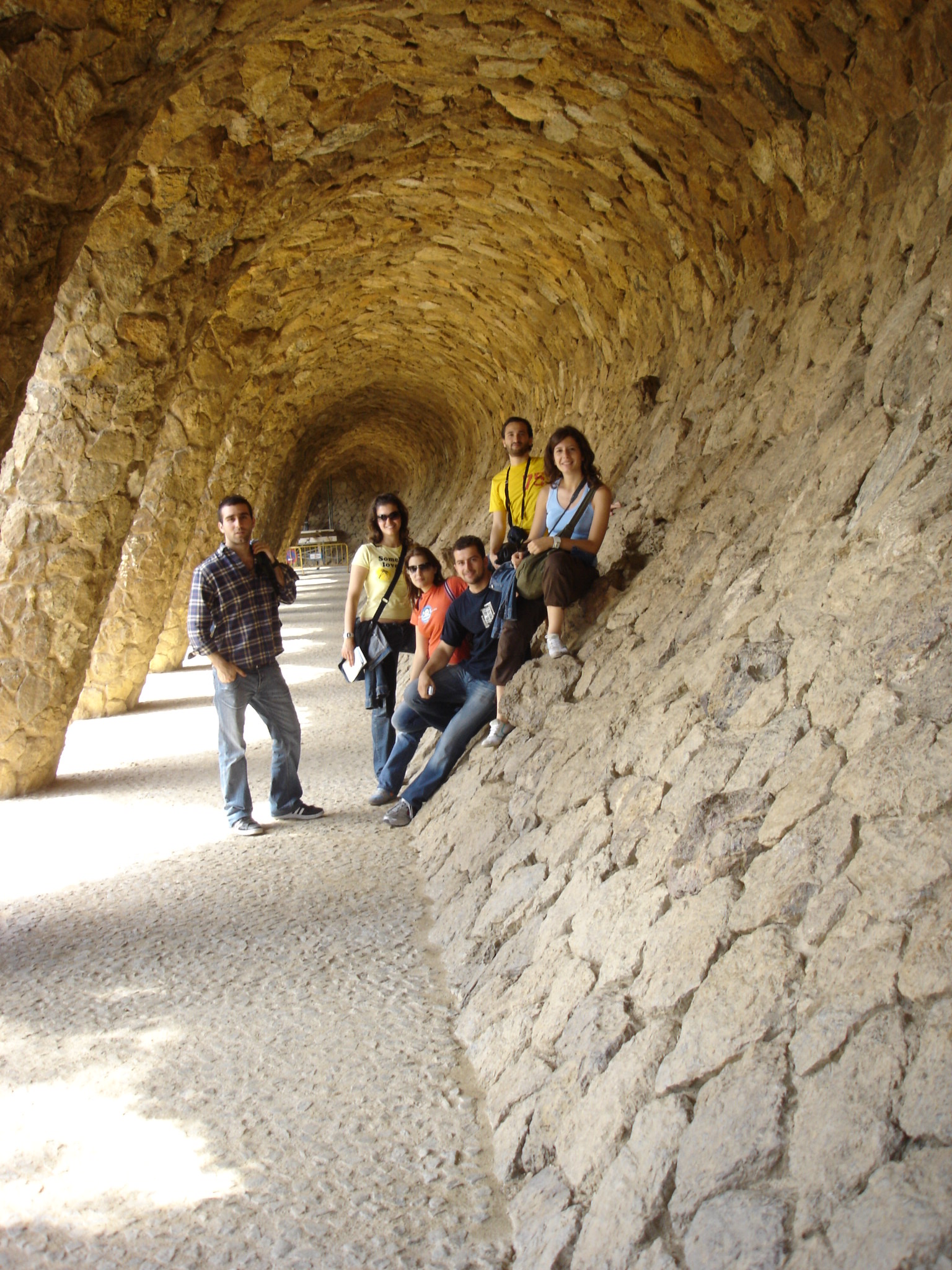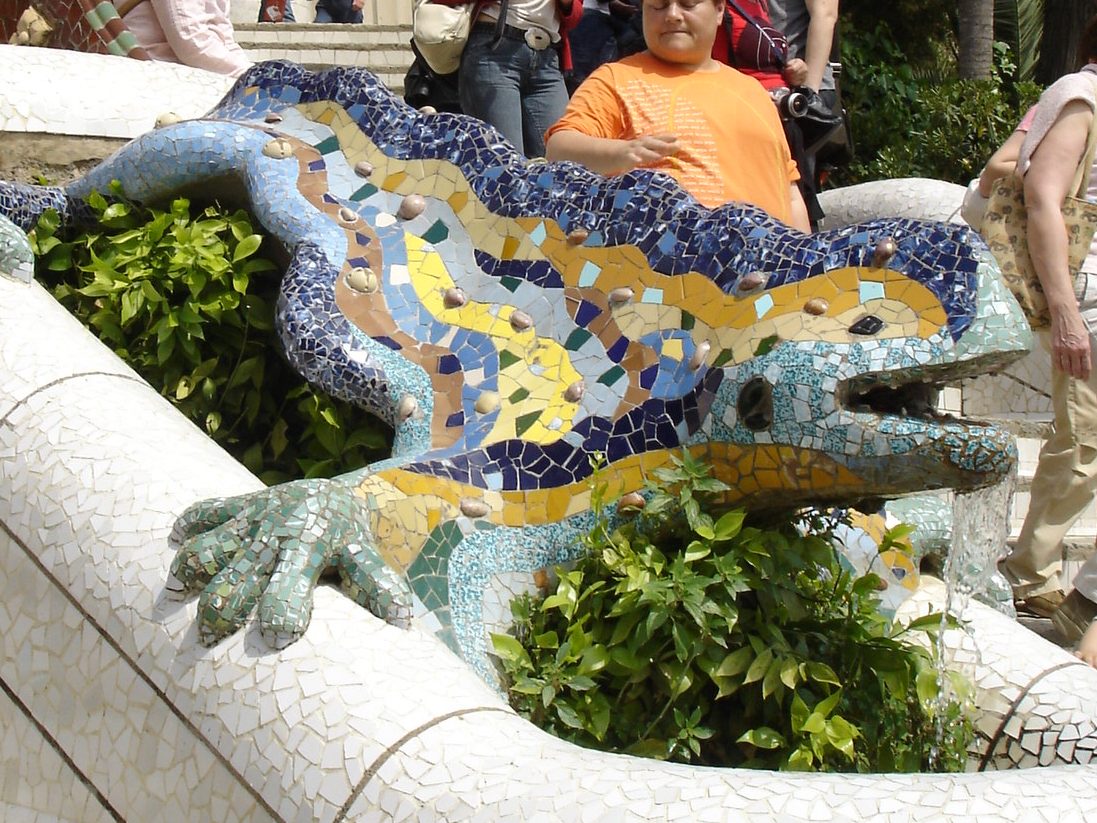 Park Guel Ένας ακόμα τόπος τουριστικού προσκυνήματος είναι αυτό το πάρκο στην Βόρεια Βαρκελώνη. Σχεδιασμένο από τον Γκαουντί, γεμάτο με όμορφα γλυπτά, πρωτότυπες πινελιές και μεταξύ άλλων τη σαυρίτσα El drac , ένα γλυπτό/μωσαϊκό φτιαγμένο με την τεχνική trencandis. Είναι περισσότερο η τόλμη στην σύλληψη των διάφορων λεπτομερειών που ίσως κάποιος πιο ειδήμων στα θέματα της αρχιτεκτονικής θα μπορέσει να εκτιμήσει. Στις τότε φωτογραφίες μας πάντως μοιάζουμε σαν ροκ συγκρότημα παρά την κούραση μας.