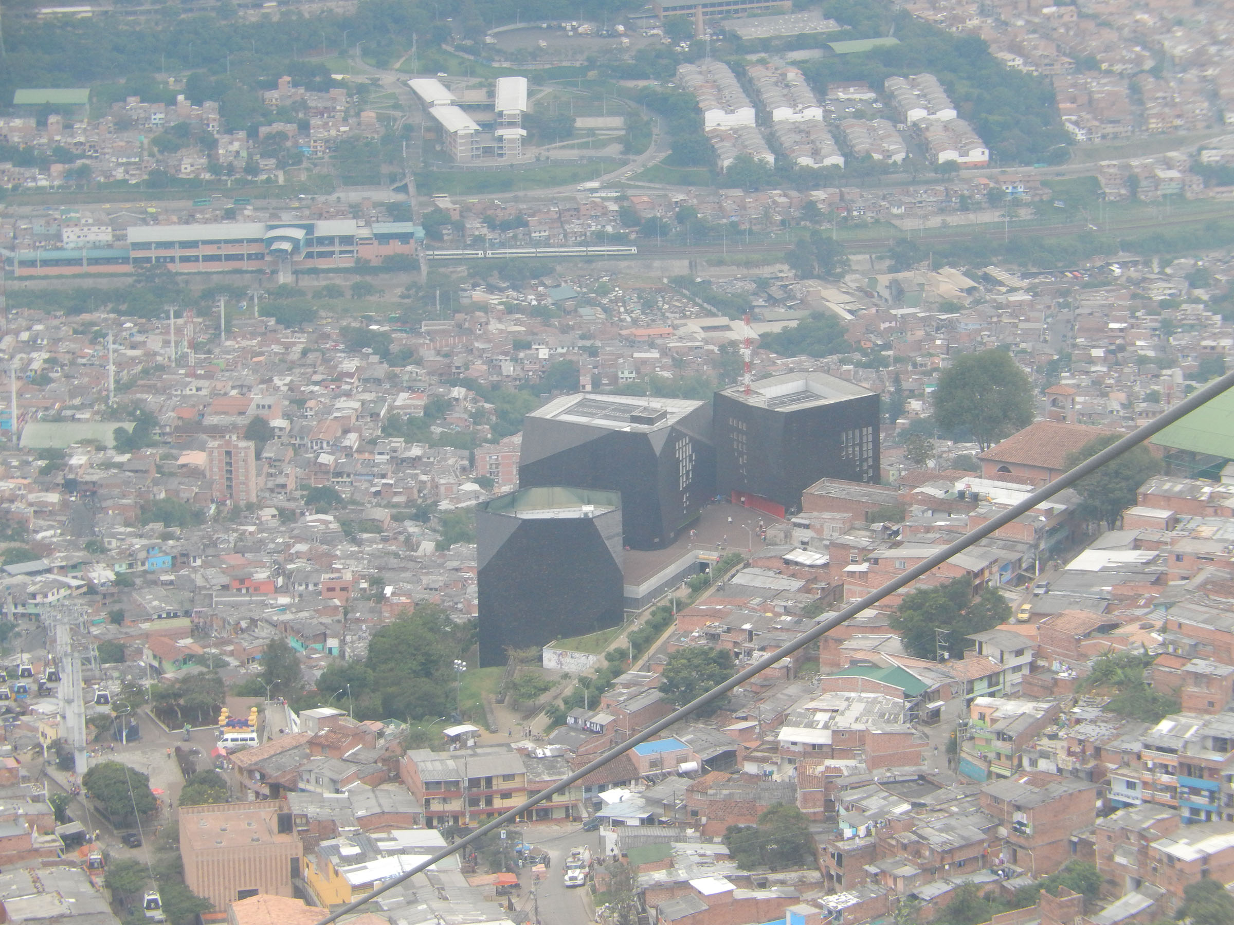 Η βιβλιοθήκη Parque biblioteca espana είναι ίσως το μόνο κτίριο που θα μπορούσε να θεωρηθεί αυτοτελές αξιοθέατο εδώ πέρα. Είχα πρωτοακούσει πριν χρόνια για αυτήν όταν την είδα ως θέμα ντοκιμαντέρ για την πόλη. Οι δημοσιογράφοι/δημιουργοί της εκπομπής την παρουσίαζαν σαν έργο-σύμβολο της προσπάθειας των αρχών να μην αφεθούν στην τύχη τους τα παιδιά των μη έχοντων ( μη έχοντων του απόλυτου τίποτα). Αρχιτεκτονικά η τοποθέτηση της στο χώρο είναι πολύ ενδιαφέρουσα, σαν δύο τρία μαύρα πετράδια ριγμένα τυχαία στο έδαφος.