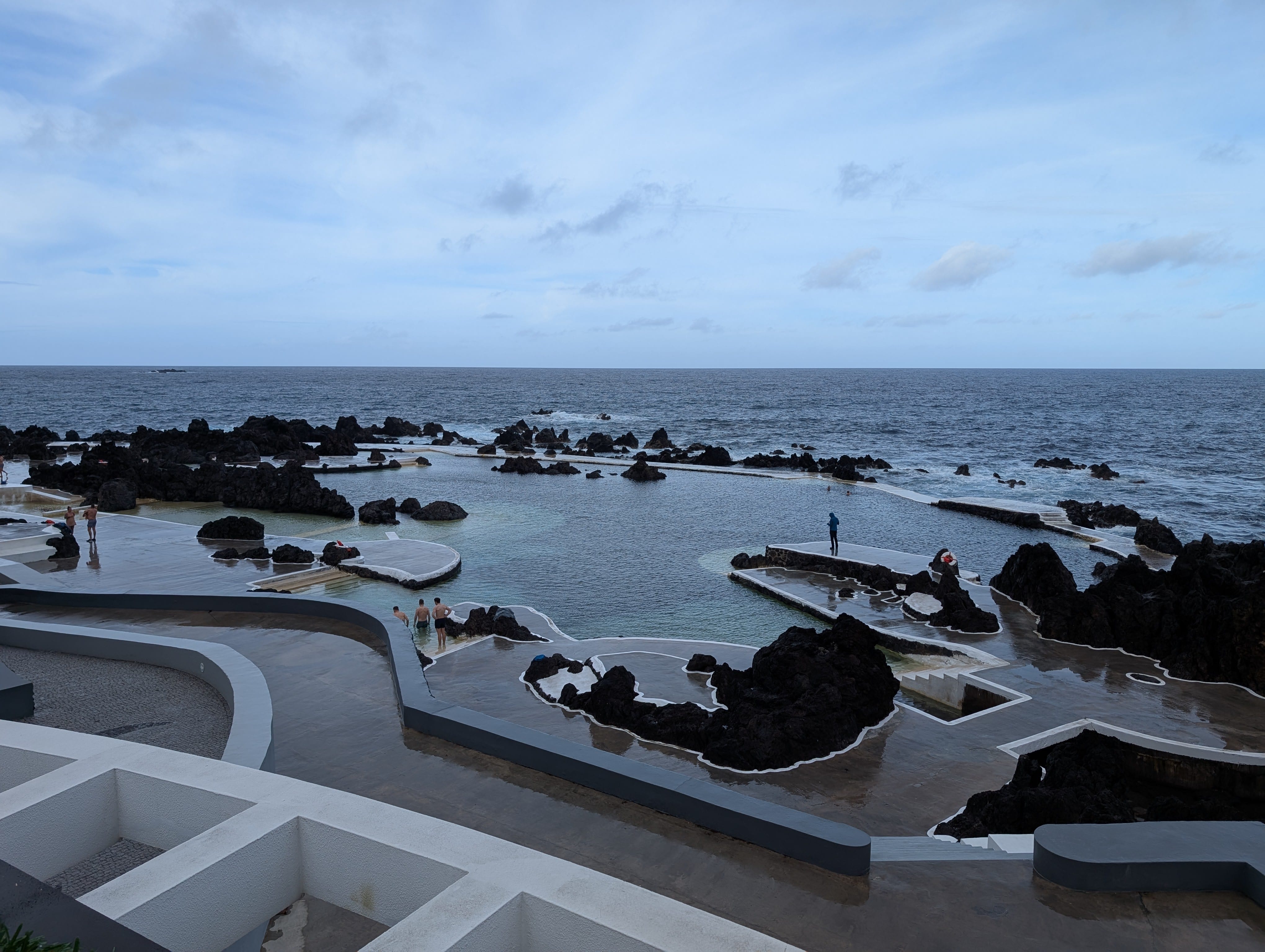Δυστυχώς την τελευταία μας μέρα πέσαμε και εμείς στην απόλυτη τουριστική παγίδα της περιοχής και επισκεφτήκαμε τις Piscinas Naturais/φυσικές πισίνες της Μαδέιρα. Πολυδιαφημίζονται παντού ( εμείς συγκεκριμένα πήγαμε στις εγκαταστάσεις του Porto Moniz) μα παρά την φωτογένεια τους δεν είναι τίποτα παραπάνω από ένα τσιμεντοποιημένο λαγούμι με πολύ κρύο νερό δίπλα στη Θάλασσα.