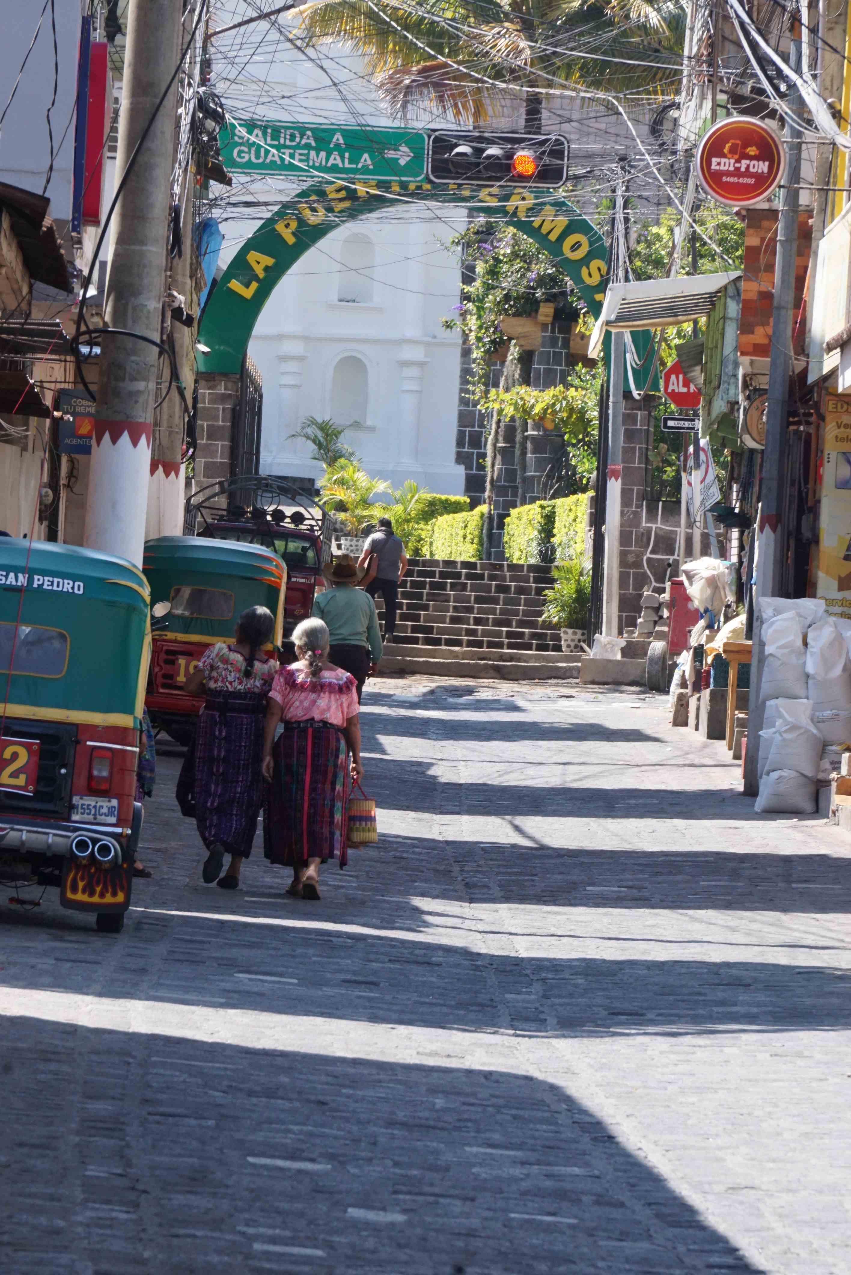 San Pedro de la Laguna : Δημοφιλής προορισμός από τον οποίο μπορεί να κανείς να προσεγγίσει περπατώντας και το γειτονικό San Juan de la Laguna. Παρά την τουριστική δημοφιλία, η ανέχεια και στις δύο κοινότητες είναι διακριτή . Πέρα από κάποια καφέ και εστιατόρια οι υπόλοιπες επιχειρήσεις είναι αρκετά βασικές, ειδικά τα μαγαζιά με ηλεκτρικά που μοιάζανε περισσότερο με αποθήκες. Στολισμοί που κρέμονται από σύρματα δίνουν χρώμα και λίγη αναγκαία σκιά.