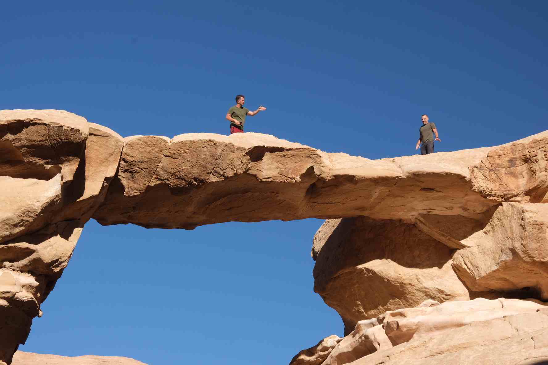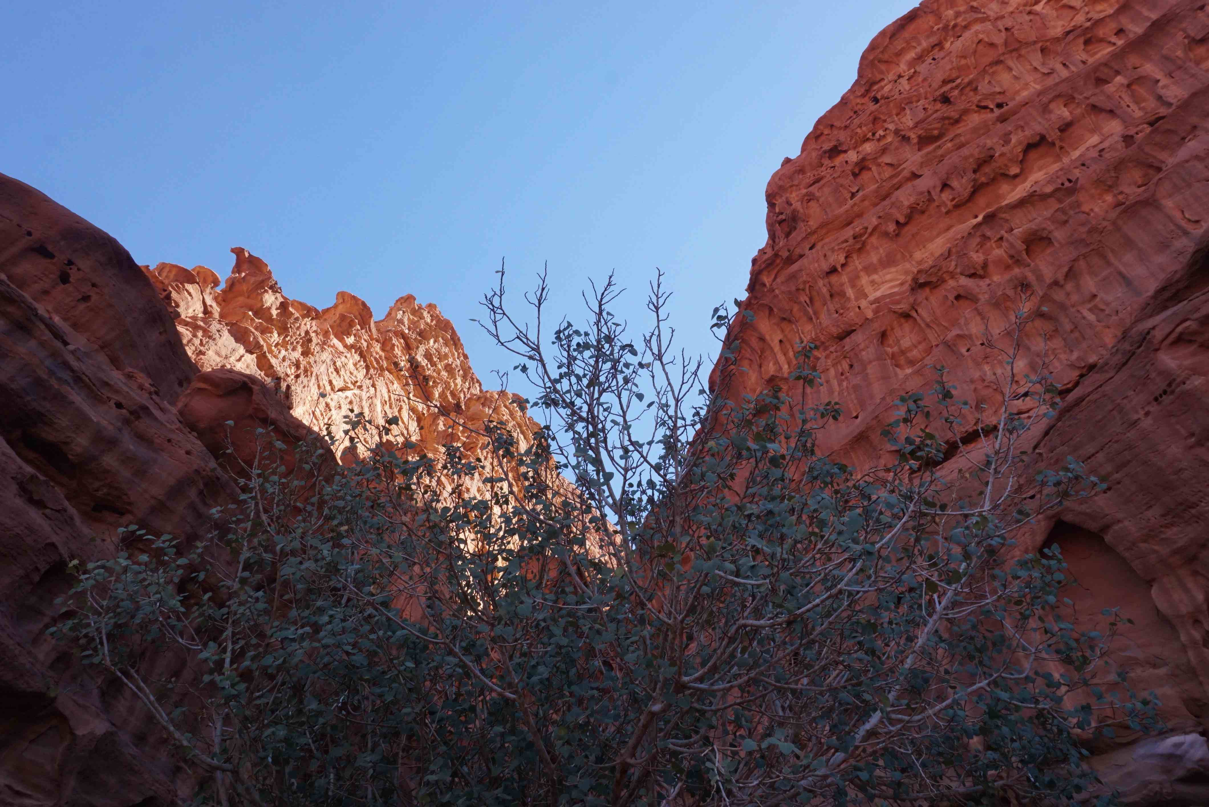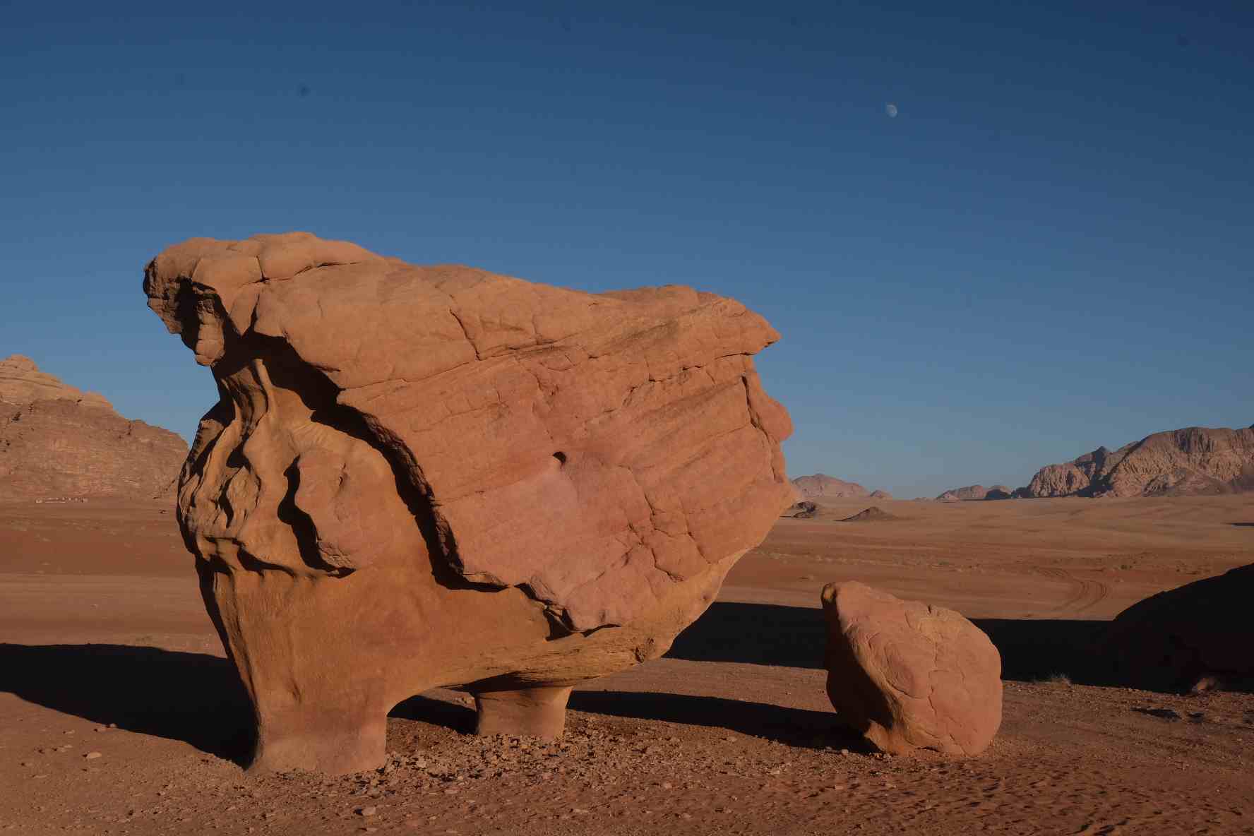 Το τοπίο είναι γεμάτο επιβλητικά πετρώδη βουνά, διασπαρμένα στην άνυδρη έκταση τα οποία προσφέρουν ανάσες στην σκιά τους και που δημιουργούν μία εναλλαγή εικόνων. Πέραν των τζιπ με τους τουρίστες και τις διάφορες καμήλες ( κάποιες με δεσίματα στα πόδια ώστε να μην τρέχουν και περνάνε τα σύνορα προς τη Σαουδική Αραβία ) που νωχελικά βαδίζουν, δεν υπάρχει κάτι άλλο που να κινείται εντός του οπτικού μου πεδίου. Ο οδηγός μας οδηγεί σε ιδιαίτερα απότομους βράχους και μας προτείνει στο καπάκι να τους σκαρφαλώσουμε, λες και είναι το πιο εύκολο πράγμα στο κόσμο. Έχει ενδιαφέρον πως ένας άγριος, αφιλόξενος τέτοιος τόπος θεωρείται ότι πρέπει να προστατευθεί. Αναρωτιέται αρχικά κανείς από τι ; Η απάντηση έρχεται γρήγορα και είναι πιθανότατα από την άτσαλη τουριστική ανάπτυξη που δεν σέβεται την γεωμορφολογία του όπως έχει. Παραδόξως εδώ επιτρέπεται η ορειβασία ( υπό ποιες προϋποθέσεις δεν το έψαξα )