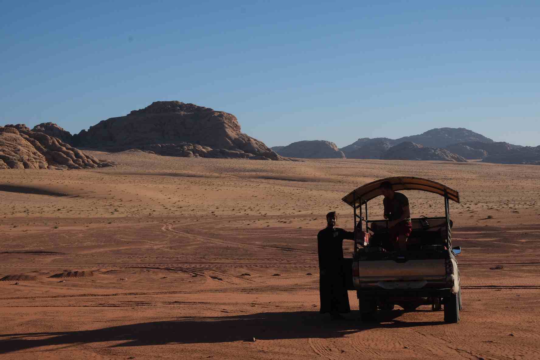 Οδηγώντας εντός του Αμμάν ακόμα και για έναν έλληνα οδηγό θα αποτελούσε πρόκληση μα αντιθέτως η πορεία κατά μήκους του desert highway είναι εύκολη και ενδιαφέρουσα, μία απέραντη ευθεία ενώ στα δεξιά και αριστερά μας εκτυλίσσονται εικόνες της αραβικής υπαίθρου που δίνουν έναν επιπλέον εξωτικό τόνο. Χαζεύω μία καθημερινότητα που οι άνθρωποι μοιάζει να τη ζουν κυρίως έξω από το σπίτι, τουλάχιστον οι άντρες που συναθροίζονται έξω από επιχειρήσεις γνωστών τους για να μιλήσουν και να κάνουν παρέα ο ένας τον άλλον, μία παρεμφερή κατάσταση με την αντίστοιχη ελληνική καφενειακή. Προς το τέλος της ημέρας θαυμάζουμε ένα απόκοσμο ηλιοβασίλεμα με φόντο τις ανεμογεννήτριες ενός αιολικού πάρκου.